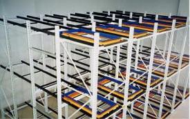 Pushback rack provides very high-density storage in applications that will allow for LIFO (last in, first out per lane). High capital investment with the best use of space.